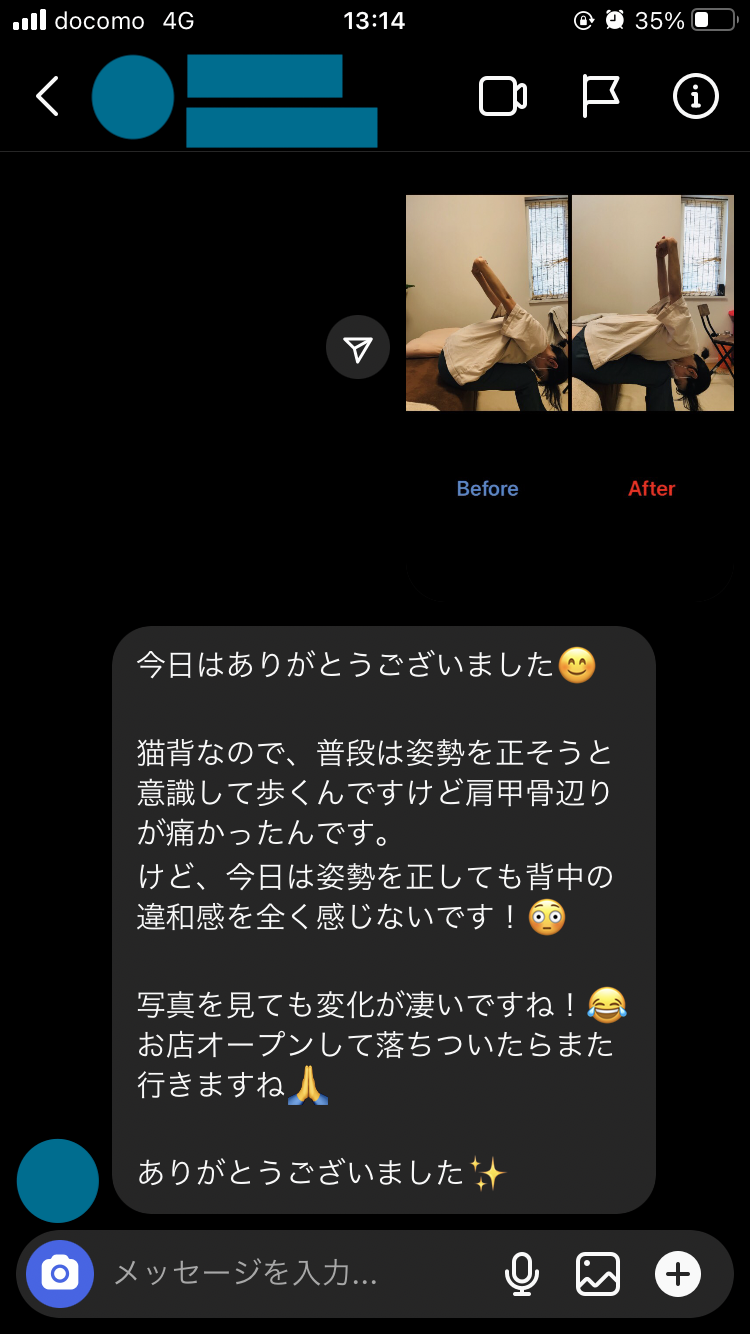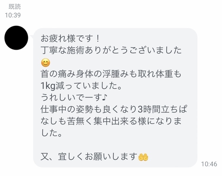 仕事中の姿勢も良くなり、3時間立ちっぱなしも苦なく集中できるようになりました。また、よろしくお願いします」