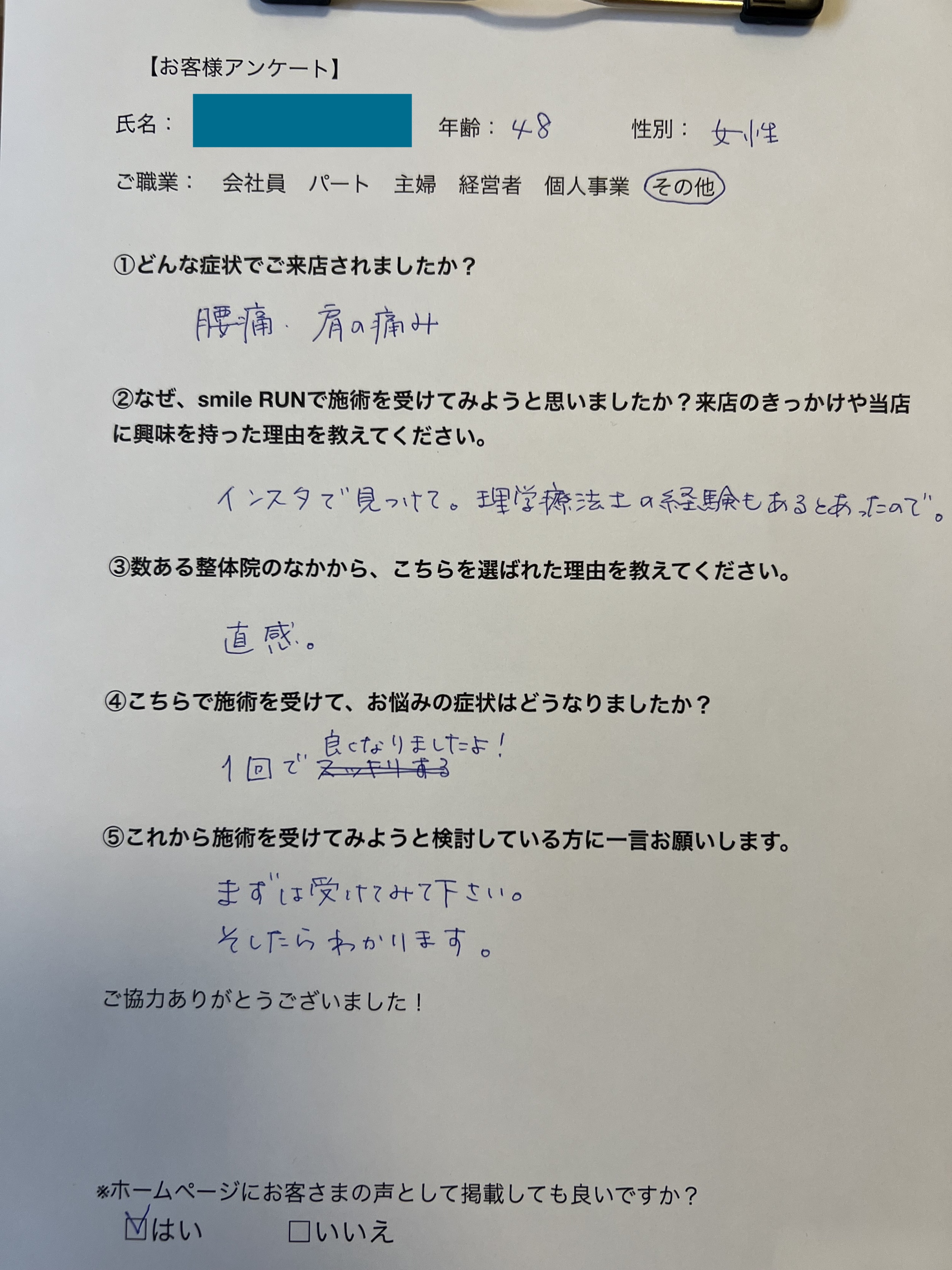 口コミがとても良くて、ホームページも見てみたらとても良さそうなサロンだな〜と思ってsmile RUNに決めました!